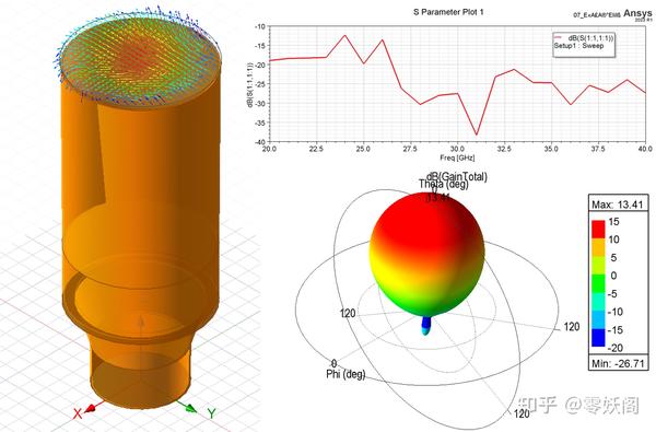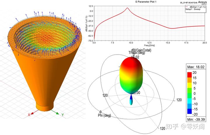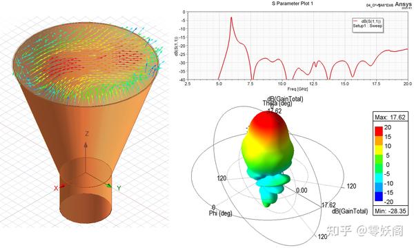 下圖給出了圓錐喇叭天線的仿真結(jié)果。