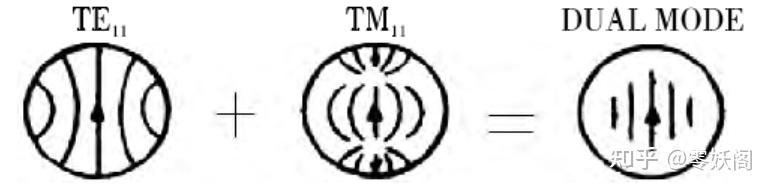 雙模圓錐喇叭通過(guò)引進(jìn)一個(gè)高次模 TM11 模來(lái)改善 $E$ 面方向圖,使其方向圖具有軸對(duì)稱的等化波束特性。下圖是圓波導(dǎo)中主模 TE11 模和高次模 TM11 的口徑電場(chǎng)分布及其合成后的口徑場(chǎng)分布示意圖。